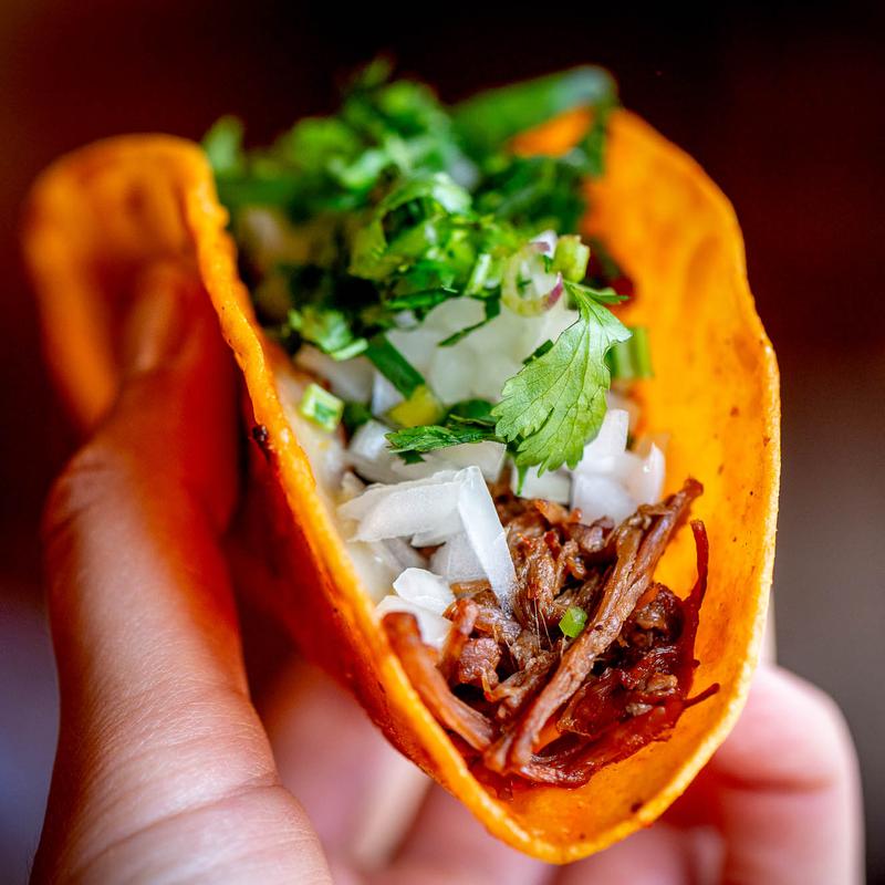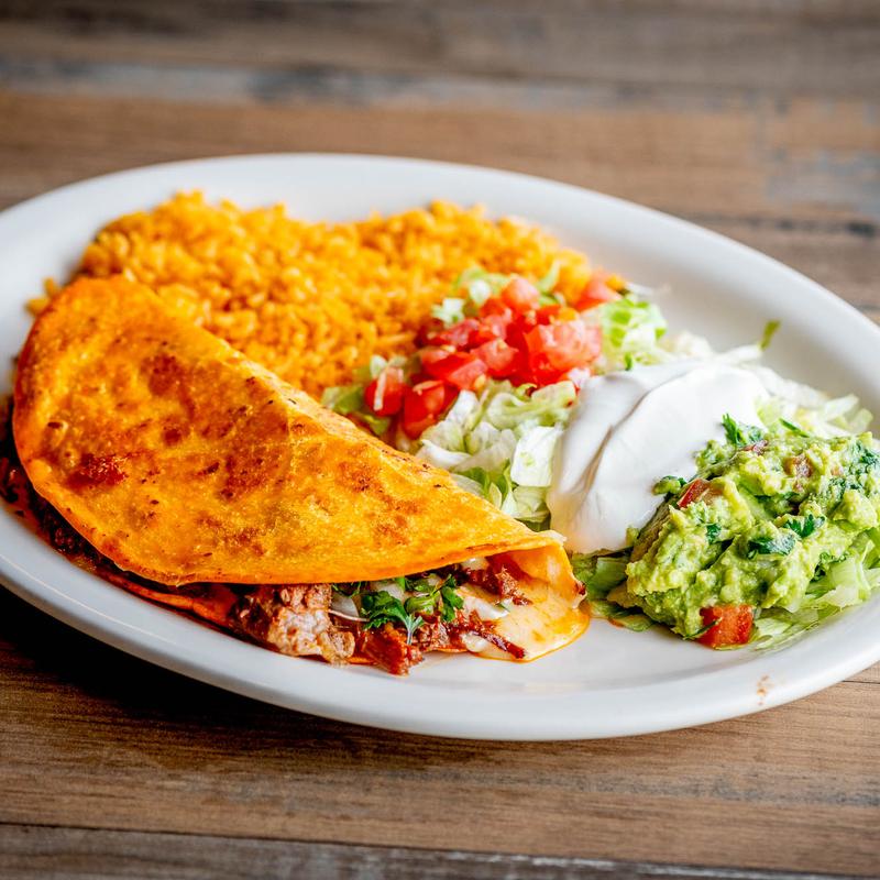 Two corn tortillas stuffed, rolled, and fried with one chicken & one beef, served with rice, lettuce, tomatoes, sour cream & guacamole