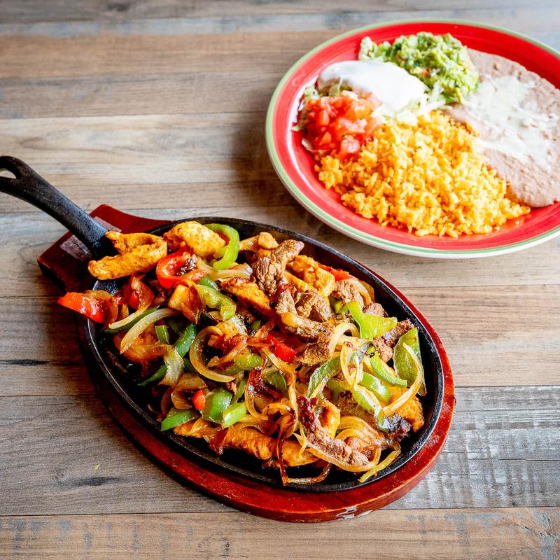 Grilled red, green, and yellow bell peppers, onions, tomatoes, and your choice of protein. Spanish rice, fried beans, lettuce, tomatoes, guacamole, and sour cream with 3 flour tortillas