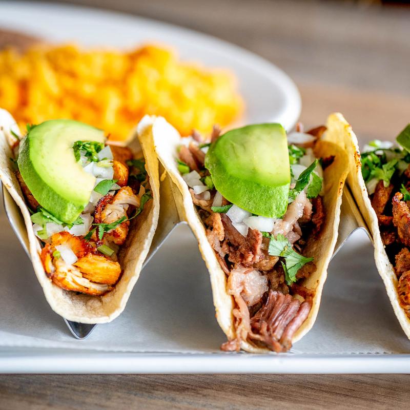 Three flour tortillas loaded with fresh avocado slices, chopped tomatoes, red onion, and cilantro served with a side of white rice and spicy tomato sauce