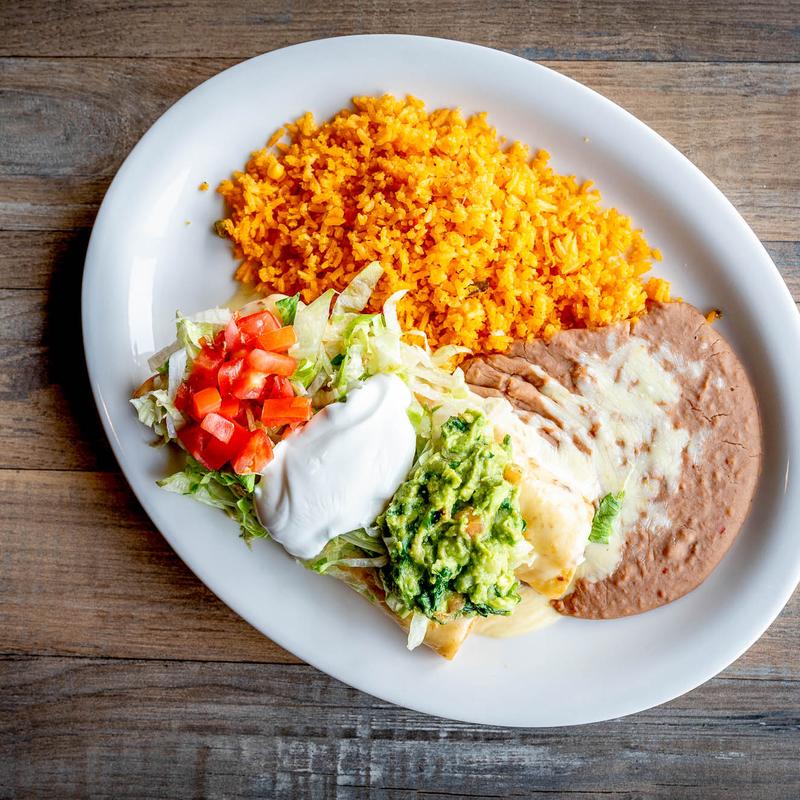 One beef or chicken burrito topped with cheese, lettuce, tomatoes & sour cream. Served with rice