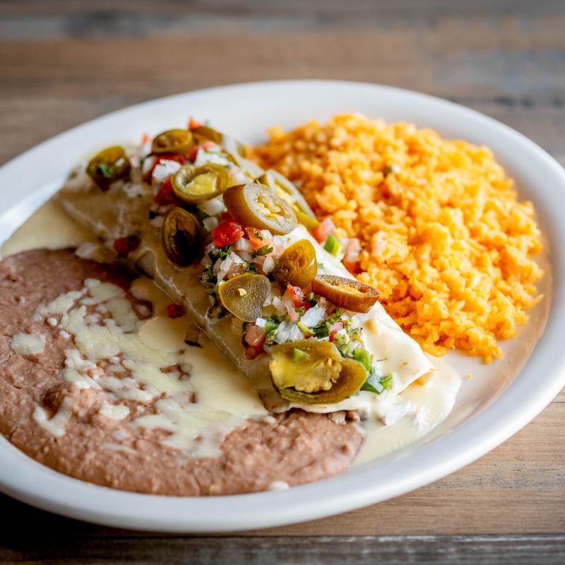 Braised pork burrito smothered in cheese dip & topped with pico de gallo & jalapeños. Served with rice and beans