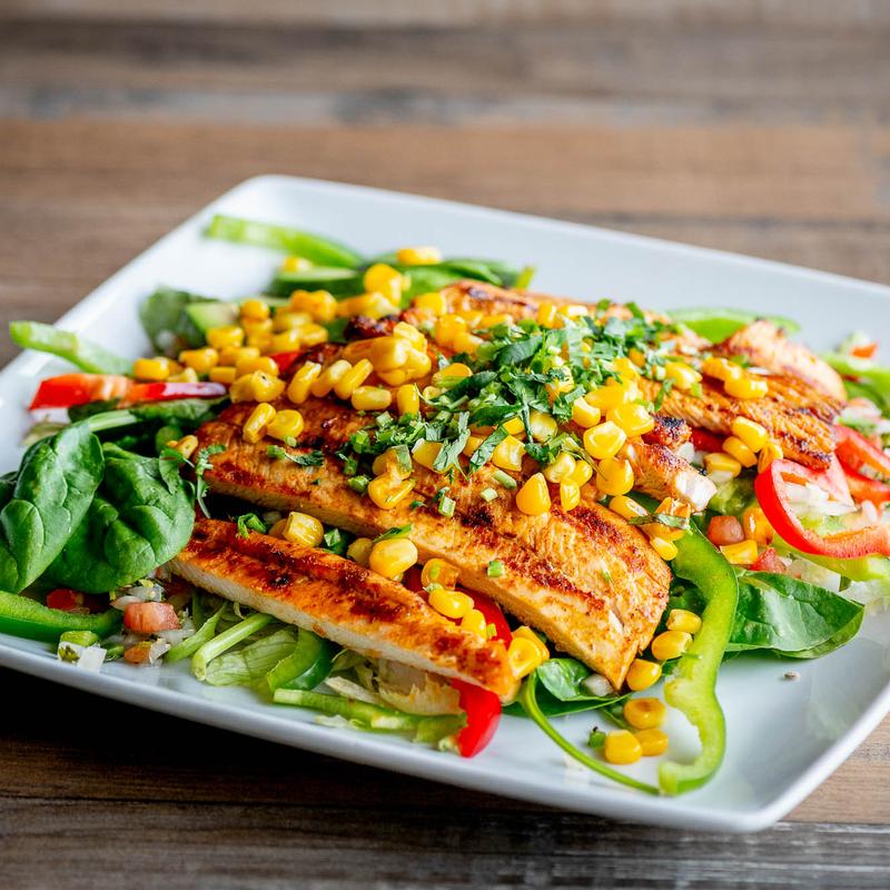 Served with a mix of lettuce & spinach, avocado slices, pico de gallo, grilled corn, cilantro & bell peppers